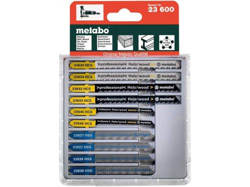 Разновидниот сет на ножеви за убодна пила Metabo 623610000 кои се состои од 10 парчиња, од кои две се за работа во метал, а осум за дрво.